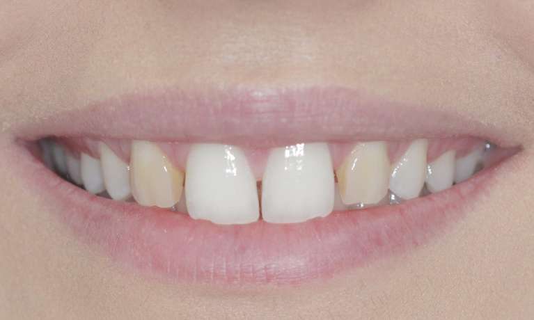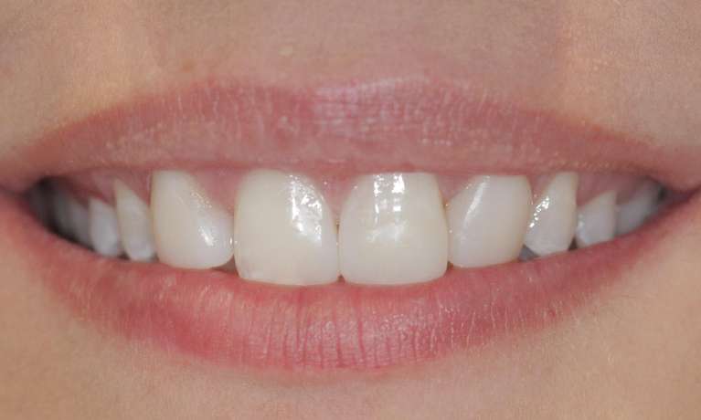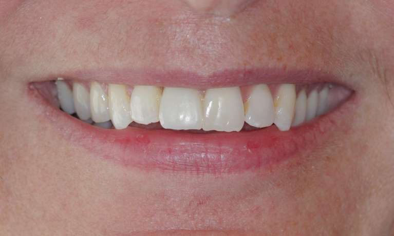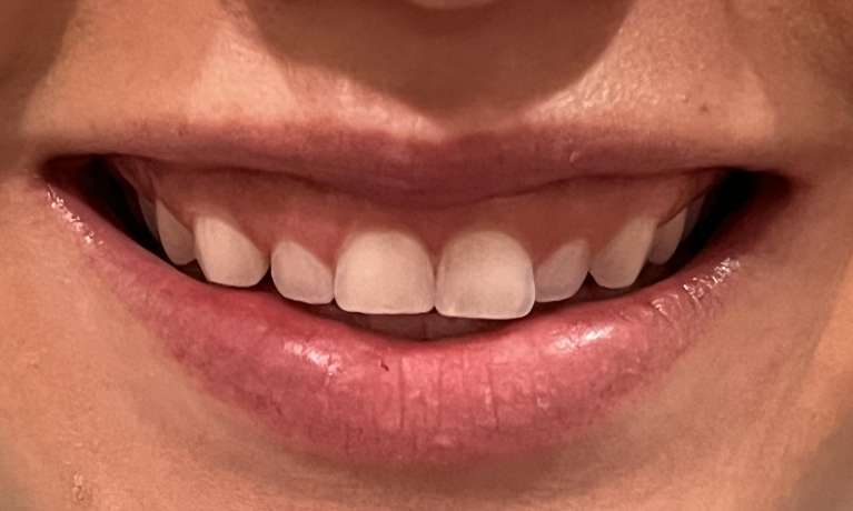 This patient felt her small "lateral incisors" next to the upper central teeth were too small. She also didn't like how one central tooth was shorter than the other.