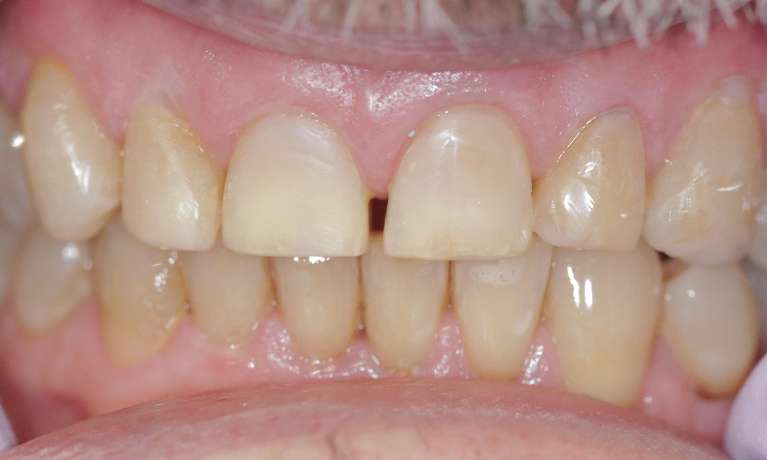We discussed porcelain veneers and resin veneers, and this patient wanted to match his other front teeth with resin veneers. He did not want to close the space between the front 2 teeth.