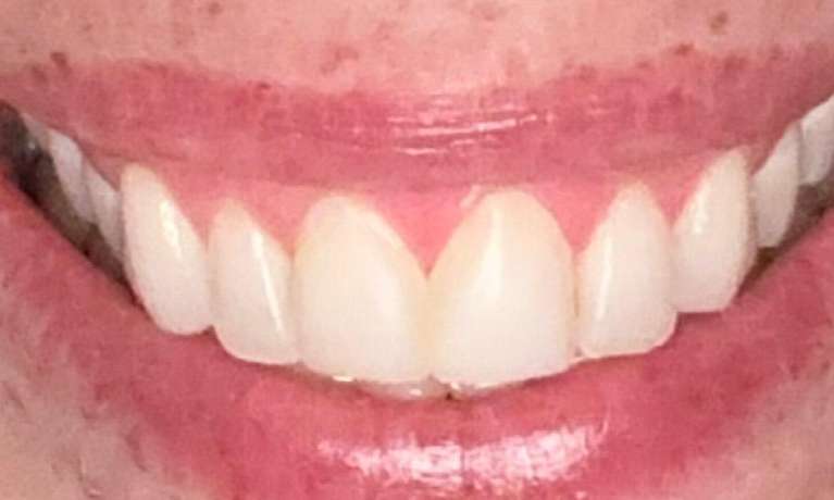 This patient didn't like the appearance of her front two teeth. Years of acid erosion (lemons, acidic drinks) had worn the enamel and altered their appearance.