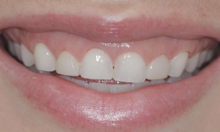 This patient had worn braces in the past and did not want to wear them again. She also did not want porcelain veneers. She was unhappy with how her 2 front teeth seemed so much more prominent and "big" in pictures.