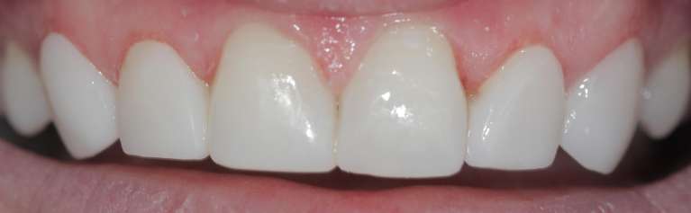 So we used a laser to reduce the "puffiness" of the gum tissues, and allowed a week for the gums to settle into their new position. Then we used cosmetic bonded veneers on the two side teeth to add length and width to make them more proportional to her other teeth.