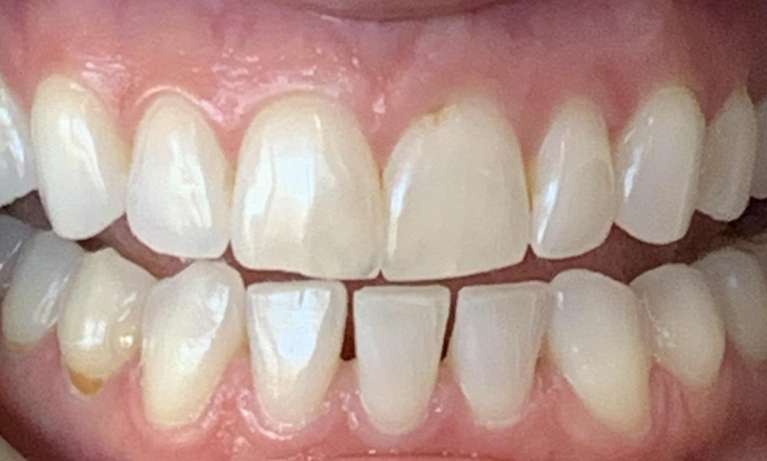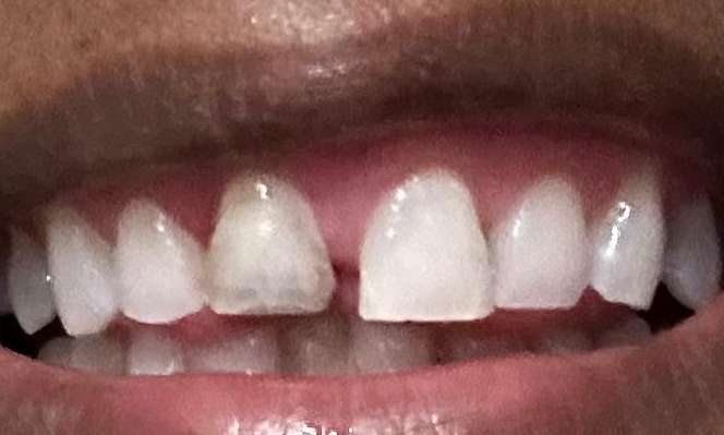 During her initial exam, we realized that her front teeth tilted in slightly, which caused them to appear smaller and darker in photos.