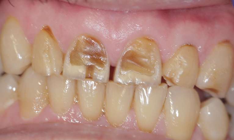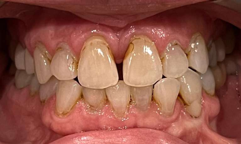 This patient had consumed soft drinks and grinded his teeth for years, causing extensive erosion and tooth wear to the point that he would only smile with is mouth closed.