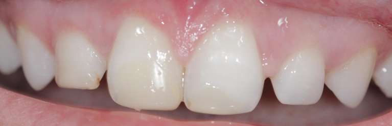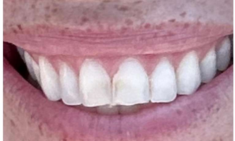 So first we used a laser to sculpt the gum tissues to lengthen the teeth, which would help prevent the newly bonded front teeth from looking too wide.