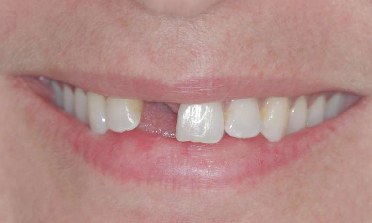 Tooth loss due to trauma, and unfortunately an implant was not an option. A bonded porcelain Maryland bridge gave us a beautiful alternative!