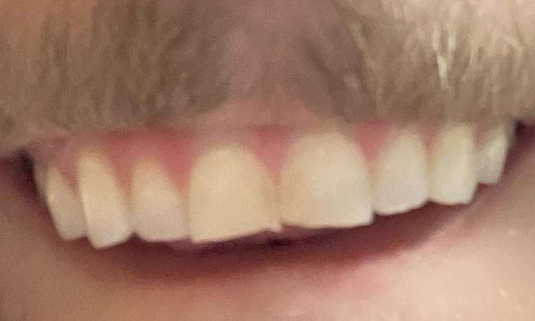 This patient grinds his teeth at night and chipped the front 2. We placed resin veneers to build them back to full contour, and are going to make him a nightguard to protect them while he sleeps.