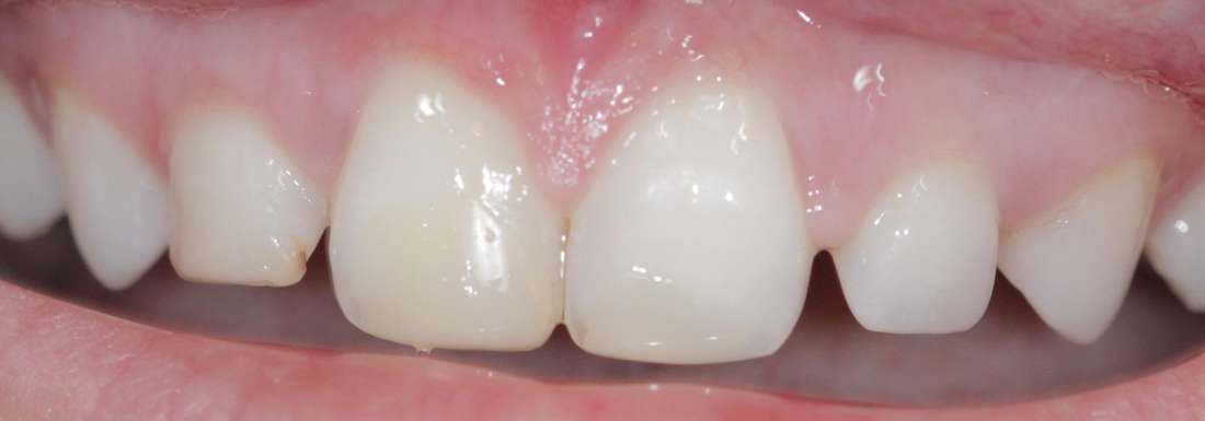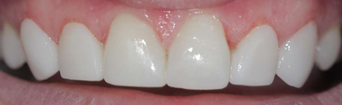 This patient was unhappy with old, stained resin on her front teeth.  We discussed porcelain veneers versus cosmetic bonding, and decided to go with the more conservative cosmetic bonding.   We had to do some slight gum recontouring to even out the widths of the 2 teeth (which can be seen in the photo where the gum tissue is a little irritated), and we achieved a beautiful result after a single appointment!